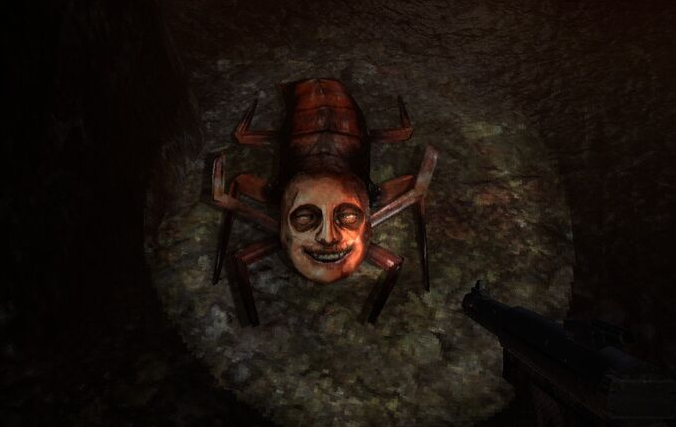 Lest you forget that this game was originally about finding your dog, an enemy type encountered midway through looks remarkably like your little pal before its whole body splits into pieces, revealing the true creature inside! This developer is pretty fond of horror movie references, so I wouldn't be surprised if this was also inspired by the giant insects from the movie Mimic, but this is something a little more alien than that; insectoid from a distance, maybe, but it's more like a fleshy stalk, six long tentacles bearing the panels of its dog disguise. It runs remarkably fast on the four little bird-like legs at its base, and the head is an indistinct, decayed-looking knob. Beautiful!