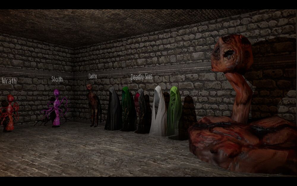 No particular name is known for this entity, but it appears in one of several optional, fan-made scenarios or "lost tapes" that play out a lot like surreal, self-contained dreams. In Lost Tape #6, the player must escape from a dark cellblock populated by vague, hooden phantoms that seem to represent the deadly sins, and takes direction from a tentacled, purple entity symbolizing Sloth. In its own dark room down its own small hallway rests a slowly pulsing mound of flesh, and if approached, a multi-mouthed head rises from the mass on a long, meaty neck.
