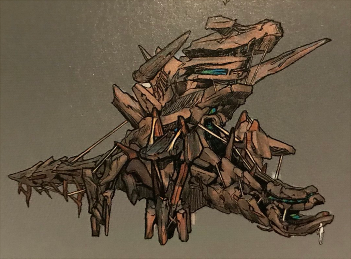 An enormous elder dragon, this monster is initially encountered as a bulky, ponderous heap of moving sand and boulders, using weird vibrations to control soil and rock, hence its title the "Earth Singing Dragon." Its true underlying form is a much lighter, faster creature once exposed, and has an almost cracked, desiccated appearance. The chest is full of holes, the head kind of resembles an exploded "sand rose" selenite stone, and many of its extremities look almost like dusty, intertwined rope, including the long spider-like fingers of its "wings," which adapted into massive hands that generate its "earth singing" through their fingertips. That's all pretty gnarly!