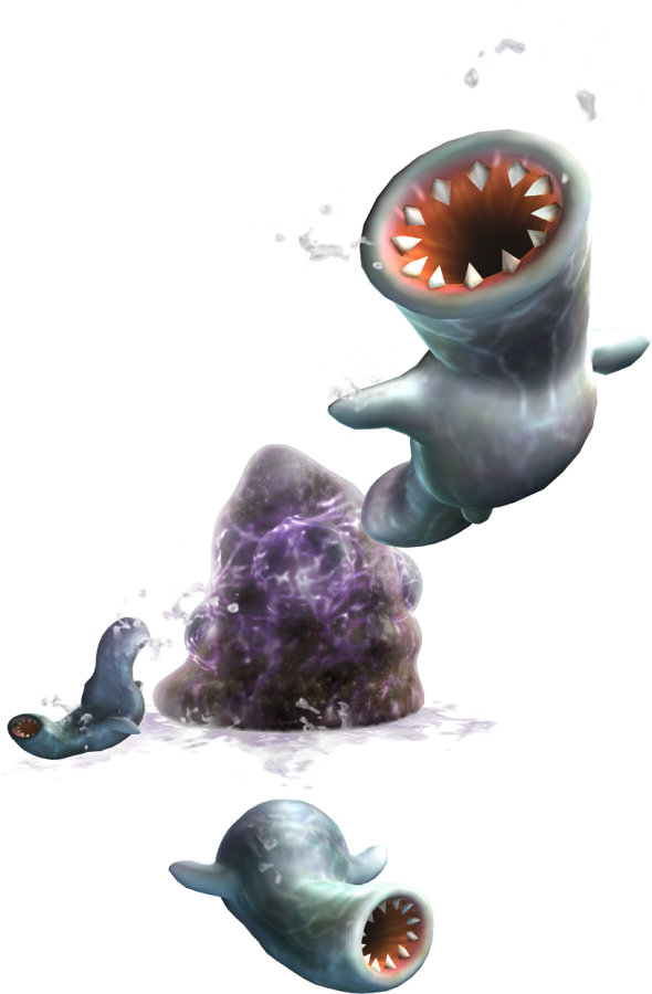 Back when the original Monster Hunter took gaming by storm, this was the monster everybody wanted me to see and eventually review. This classic was sort of the token "creepy" monster of the setting, everything about it designed to evoke what regular weirdos think is gross or unpleasant in nature. A colorless, eyeless, slime-coated troglodyte, its stretchable neck and circular, gummy maw both evoke the pop culture image of a leech or lamprey, an intention all the more apparent from the large suction cup on its tail, which it uses to dangle from ceilings! Its most prominent attack is electricity, but of course a thing that looks like this would also have acidic saliva...and, of course, a thing that looks like this would also be a parasitoid! The Khezu apparently paralyzes other monsters to implant them with their embryonic larvae, which live as parasites until the host expires or the larvae are large enough to gnaw their way out.