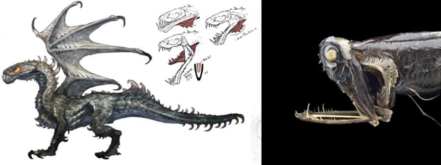 At first glance, the Baruragaru looks like a somewhat conventional "water monster" design, a sinuous lizard with spiny, fish-like fins, toothy jaws that kind of remind you of a barracuda without actually looking anything like a barracuda, and those lovably floppy-looking rubbery flipper limbs. But then it shoots out its long, chameleon-like tongue, which is actually tipped in a lamprey-like secondary mouth. It goes without saying that it uses this to drain blood and other body fluids from its prey, but in a fun twist, it will also attack the smaller monsters that most importantly include the smaller, flightless "bird wyverns" it shares certain habitats with.