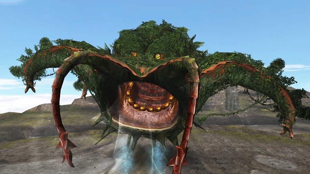 Appearing in Monster Hunter 2, a lot about this one is peculiar. It's a massive, bloated Elder Dragon that floats like a gaseous blimp, and it's so sluggish that, like a sloth, its body builds up moss, algae and other vegetation as a sort of camouflage. Further, the interior of its body serves as a nesting ground to symbiotic "thunderbugs," insects that bioluminesce so brightly they look like brilliant balls of light...and those that inhabit Yama Tsukami defend their nest by exploding, like living bombs!