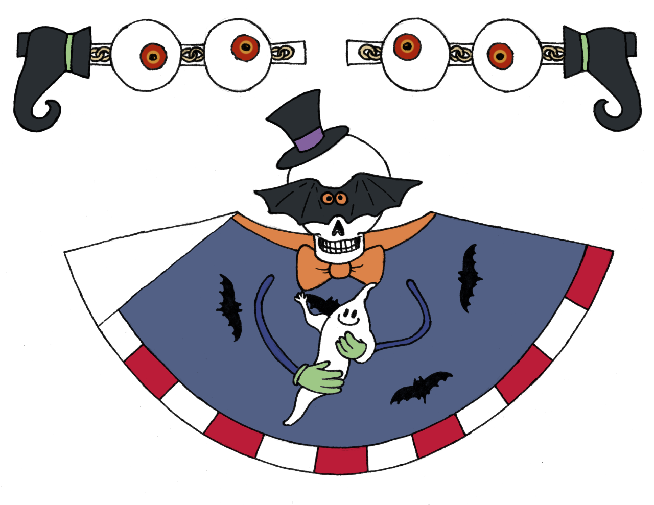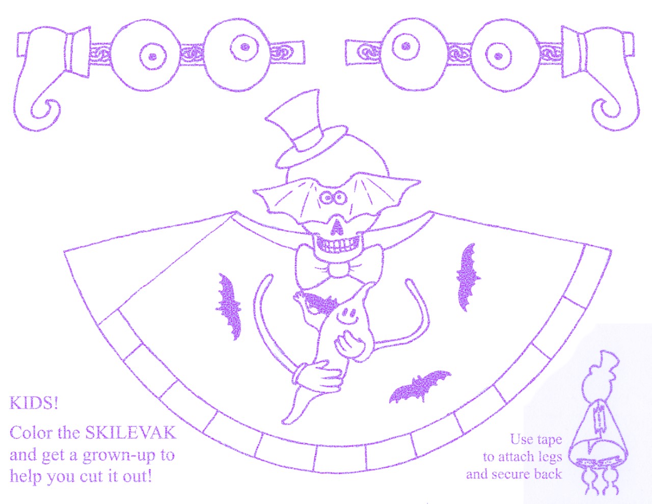 The next remarkable thing about the Skilevak is its ghost. This skull-headed monster is just plain carrying an entire, happy, baby-sized ghost in its noodly arms. Just kinda presenting a disembodied soul to us, or maybe rocking it to sleep? It's not a particularly frightening ghost. It's not even wailing or moaning or in shock like so many other Halloween ghosts. It's just got a big old doofy smile on its face. Maybe it is being rocked to sleep, or otherwise coddled like an infant. Does a Skilevak always carry a ghost? I still think it definitively has to. I think that's as essential to its lore as anything else.