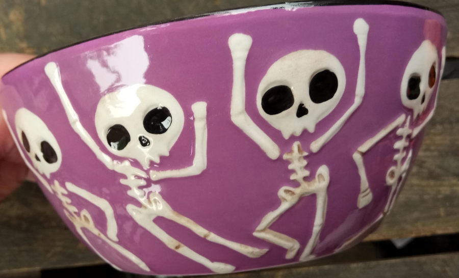 Yeah this is "just" a ceramic bowl with stuff on it, but just look at that stuff! The back of its white interior has yellow, cartoon lightning bolts, while the front of its purple exterior has a gaggle of dancing skeletons! Let's get a better look!
