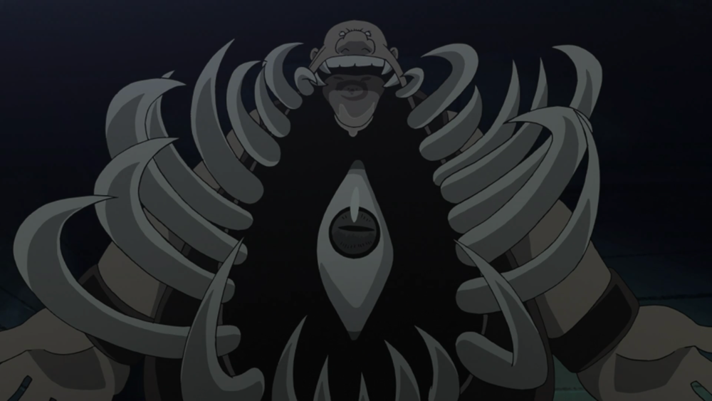 We're skipping Wrath because it's both the most "normal" human design and because its identity is a pretty big spoiler, but an even bigger twist is the human avatar of Pride, which I'm censoring right out of this image. Pride is the last of the seven Homunculi ever revealed and the second in command to their creator, an extremely lethal, sadistic entity with the expected superiority complex whose true form is a vast, formless black mass with many eyes and many gleaming white, toothy mouths, all contained within a highly inoccuous disguise it is very, very good at playing straight.