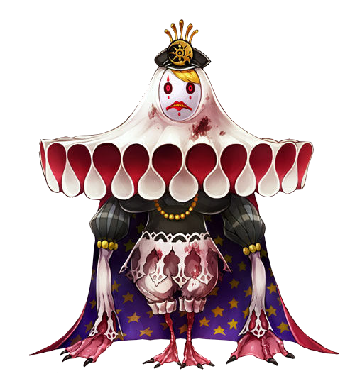 I mean, it's got a black military looking hat, and its little face sticks out of a white hood that flares into a comedically gigantic neck ruffle. Its torso gets a black top with poofy sleeves and a golden pearl necklace, it has a white doiley-like lace skirt thing and puffy white pantaloons, and finally a cape with a pattern of little gold stars. This Nightmare changes just a little after taking damage, but still in a pretty striking way: