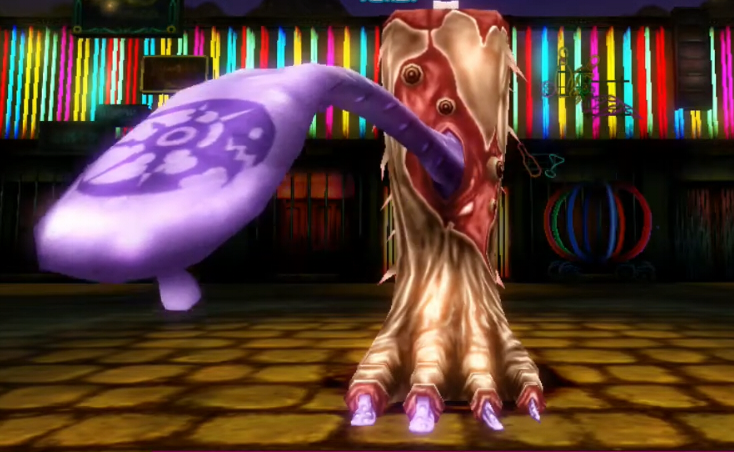 This enemy is a high heeled shoe, though where the stilleto heel should be is instead a "tail" ending in a triangular pad. I think it's supposed to look like it hangs from ceilings from that thing, like a sucker maybe, but in the came it's just sitting on the ground. The opening of the shoe is pitch black and lined with teeth, with a single reptilian eye staring from the darkness and a giant, purple tongue flopping out. Love this thing!