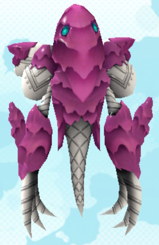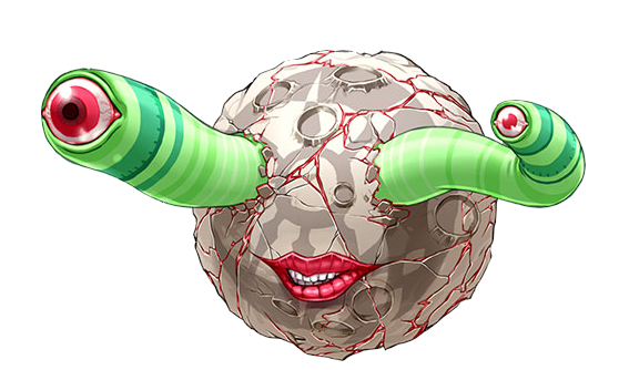 A centipede-like Marchen, with a single large human-like eye on its spiny head, and a row of human mouths with brightly colored lips all the way down its fleshy, pink underbelly. These designers were almost never content to just scale up an arthropod, but opted for absurd and dreamlike anatomical twists!