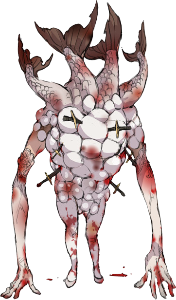 This horrible, horrible thing is by far one of my favorite Marchen body plans. It looks like a great big, lumpy, wrinkly white maggot, sticking straight up as it stands on four almost perfectly human legs. Multiple arms sprout from its body, some bloody and skinless, one bizarrely holding a skinless arm and hand. Its head is just a darkly colored ball with a glowing, yellow eye to either side of its unpleasantly yonic, horizontal mouth, wicked little white teeth in its thick gums. More of these heads sprout from its body, at different stages of development, and the second largest is situated on an almost mushroom-like stalk, as if ready to form into an entirely new "maggot."