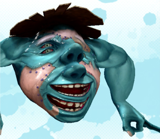 A fraky plastic spider of spindly, doll-like limbs, with a torso on top and a disarmingly friendly looking, simple head; kind of egg-like with a little green clown nose, an admittedly cute smile and closed eyes with what appear to be spectacles. The weirdest part of the whole thing are the "arms," each consisting of three more plastic, clown-nosed faces. All of theirs eyes still appear to be closed, but with a wide variety of expressions.