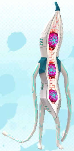 Other enemies come in a variety of names and colors, but not always design variants as noteworthy as the waterfowl. This thing is an example of a slime-like monster family found throughout the first two games, but unique among such creatures in that its otherwise invisible surface is patterned with eyeballs, and each eyeball surrounded by "electronic" looking flower petals. It's a two-dimensional texture on a 3-d model of just a jelly ball, so it's hard to say what it's supposed to really represent. At the center of this odd thing is a relatively ordinary, spherical red nucleus.