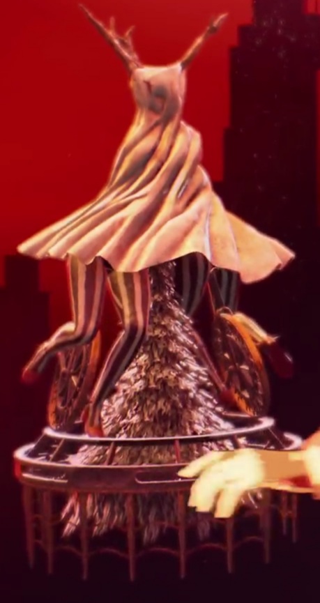 MY BEST DESCRIPTION: the name and description of this monster are story spoilers, but they don't offer any insight into its physiology or behavior anyway, so let's dive into the description. This is gonna be a fun one! The body is simple enough, a humanoid twisted so that it's doing a kind of crab-walk on its feet and its elbows, its hands clutching the sides of the enormous thing serving as its head. What do you call this thing? It's like a wooden shrine, I guess, like a wooden box with a peaked roof. A tall wooden chair sits unoccupied in the interior, which is illuminated yellow and orange, as if by candlelight. A cluster of prickly looking plants spill out the bottom. On top of the roof are two busts; heads, and necks side by side. Where each would have an exposed shoulder is instead an antler. Each also has a red gash down its neck, they have long bushy dark hair, and a dirty cloth is draped over them to just cover their eyes.