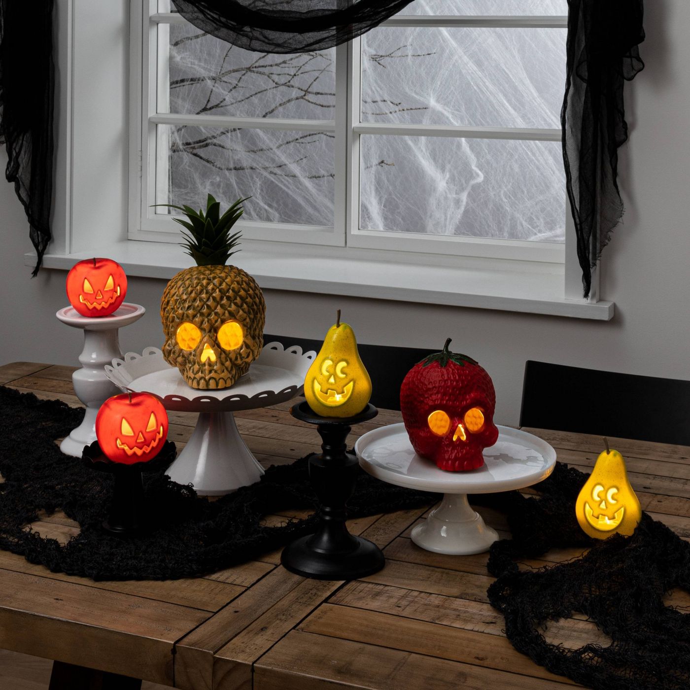 An all-new innovation! Soft vinyl Halloween fruits! Several small light-up fruits are available with Jack O' Lantern faces, including not only the apples and pears pictured here but lemons and oranges, but what's more striking is the large pineapple and strawberry shaped like human skulls. That makes me imagine an entire fruit-based skeleton.