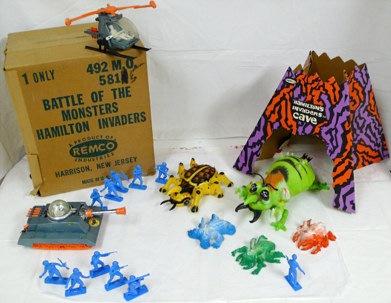 This 1964 toy line by Remco focused on a giant, monstrous insect adorably named Horrible Hamilton. Who named him that? Is that actually his birth name or chosen name? Why? Maybe he was named that by the news, like a hurricane. His design resembles no one particular kind of insect, but reminds me most of a fat, green, wingless hornet. I love his veiny, hairy looking, hump-backed thorax, almost reptilian legs, nose-like horn and the way his veiny black eyeballs protrude frog-like from the top of his head!