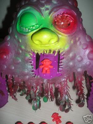 I don't know how many of these features are really part of its concept or just how the toy was manufactured for cheap, but my most literal interpretation is by far one of the most unsettling creatures I can think of. A giant, gelatinous, fuzzy, tentacled head that exists only to eat human beings. I first saw images of this toy almost twenty years ago, and its design has kind of haunted my imagination ever since. It's probably informed a lot of monsters I've designed.