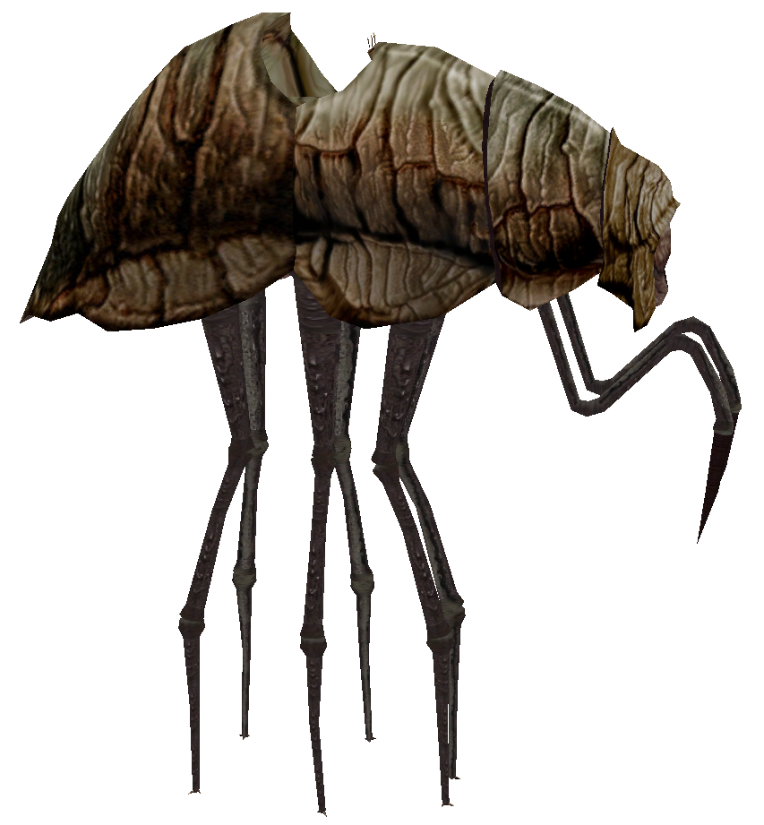 The "silt strider" obviously takes inspiration from real life water striders in both design and name--carnivorous insects that skate across the water's surface on their stiltlike legs, waiting to pounce on any hapless insects that fall in. It even shares the water strider's mantis-like raptorial forelimbs! It seems too large to skate across the water's surface, but other animals the same size are seen floating weightlessly in Morrowind, so that means nothing.