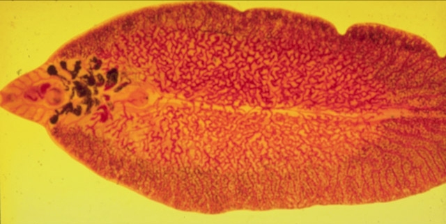 Now this one has to have been the real, actual inspiration for today's Belly Bug; not only is this fluke mostly pink or reddish with a pale "stripe," (the central line of its own internal organs) not only is it found almost all over the world and not only does it inhabit the digestive tract, but in stark contrast to the blood flukes we saw yesterday this thing is a GARGANTUA. Sure, it pales in comparison to its distant tapeworm cousins who can grow several meters in length, but most flukes that can infect us humans are nowhere near the 2-4 inches buski can attain. If our author studied any real parasites at all, this would have been by far one of the easiest to observe, and in no short supply either...as we'll get to.