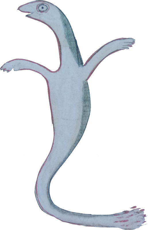 This one feels very different from other designs we've seen. It's almost like a cute little baby dinosaur without any hind legs! Or like a fat salamander! I wish there was a little more explanation in the book for the purposes of its brushy tail or little arms; some of these are left to our imagination, while others demonstrate more detailed reasoning behind their designs.TODAY'S REAL WORLD PARASITE: