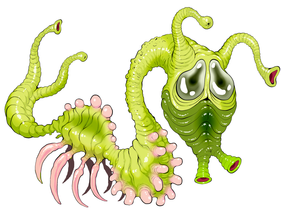 This monster's large head is shaped almost like an insect chrysalis, with two milky, mournful looking teardrop-shaped eyes. Two fleshy, sucker-tipped antennae sprout from the top of the head, while the segmented "muzzle" splits into two shorter, thicker tubes at the bottom. The head hangs from a weak looking tubular neck that flares into a caterpillar-like upper body with two rows of pink, nublike feet. A second body segment resembles a shortened, hunched spinal cord with several pairs of rib-like legs, and a swollen, maggotlike tail segment splits into two more tubular feelers.