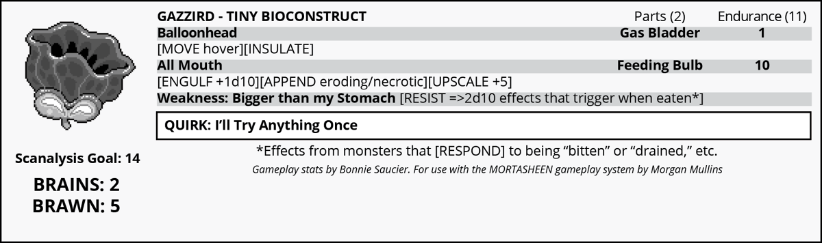 The "upscale" block attached to the "engulf" block is what allows Gazzird to swallow things larger than itself; a block normally costs a single point towards a monster's total limit, but some blocks have effects that can be boosted by additional points. +5 to Engulf means that this tiny monster can swallow things up to 5 categories larger, which means Gazzird can eat anything other than the absolute largest kaiju-scale monsters in the setting.
