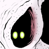 This monster's lower body resembles a dark, bloated anglerfish with many long, thin teeth. Sprouting from the pale blue inner flesh of its maw is its upper body, a translucent mermaid-like shape with long, thin arms and a rounded, humanoid head. The upper face is mostly covered by gelatinous tentacle-like "hair," but two bright white, circular glowing eyes shine through the jellylike tissue.