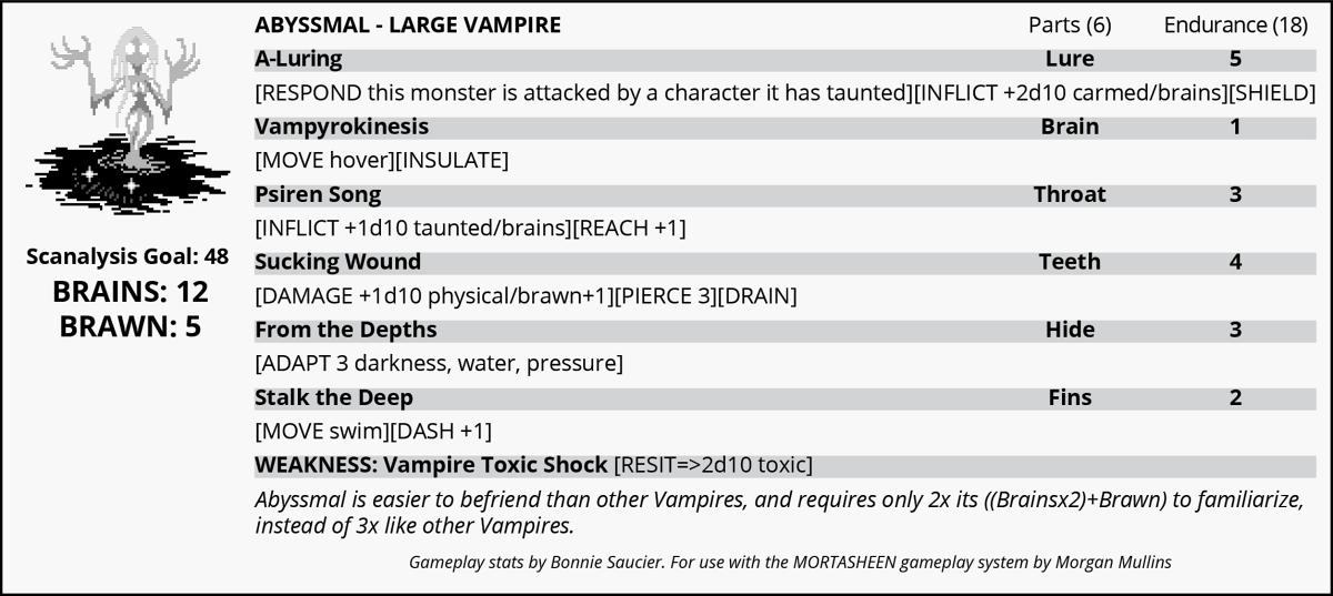 Originally just written as "abysmal," this was one of the first vampire types ever made back when the setting was known as "Necromon," and in its first incarnation, the humanoid lure was rationalized as some sort of tiny fairy-like metahuman mutant that had fused with a vampiric anglerfish over many millenia.This kind of strained explanation was eventually dropped when I simply decided that all vampiric monsters incorporated human DNA from their meals into their evolutionary processes, and began designing almost all of them as humanoid or partially humanoid fish. This, too, was phased out over time, and humanoid sea life are now considered Bioconstructs made by vampires as minions. I eventually went back again to a compromise on this, since the new "final" canon as of the book is that the vampire virus shuffles a lot of DNA between the monster and whatever it feeds upon, which is in fact a real thing that viruses do quite a bit - most living things in our world just don't really do anything with "horizontally" transferred genomes. I guess Abysmal or now "Abyssmal's" new lore comes full circle, into a middle ground between these different takes.