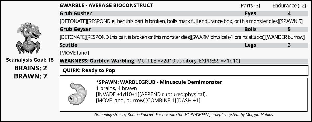 This scuttling reptiloid is lacking in maneuverability, physical strength or intellectual capacity, but it is well protected by an arsenal of stunted, heavily modified clones cultivated in dozens of blister-like epidermal pseudowombs. Incapable of surviving on its own for more than a few hours, a single "warblegrub" consists of a dense, limbless tube of muscular rings with a minimalistic central nerve cord and five razor-edged retractable jaws, lacking any other organs or vital functions other than a reflex to tunnel through any soft enough foreign material it comes into contact with. When the Gwarble feels threatened, the gelatinous outer membranes of its "warbles" are pressurized by an increase of blood flow and rapid influx of lymph, each ready to rupture at the slightest physical provocation and unleash its occupant in a geyser of steaming pus. Dozens of the bloodthirsty bioweapons wait tightly coiled in its surface warbles at any given time, with dozens of less developed but equally vicious juveniles writhing deeper beneath its skin. A single pair of greatly enlarged grubs occupy what are anatomically a set of repurposed eyes, and possess enough ganglia to function for more extended periods after disconnection from the monster's circulatory system.