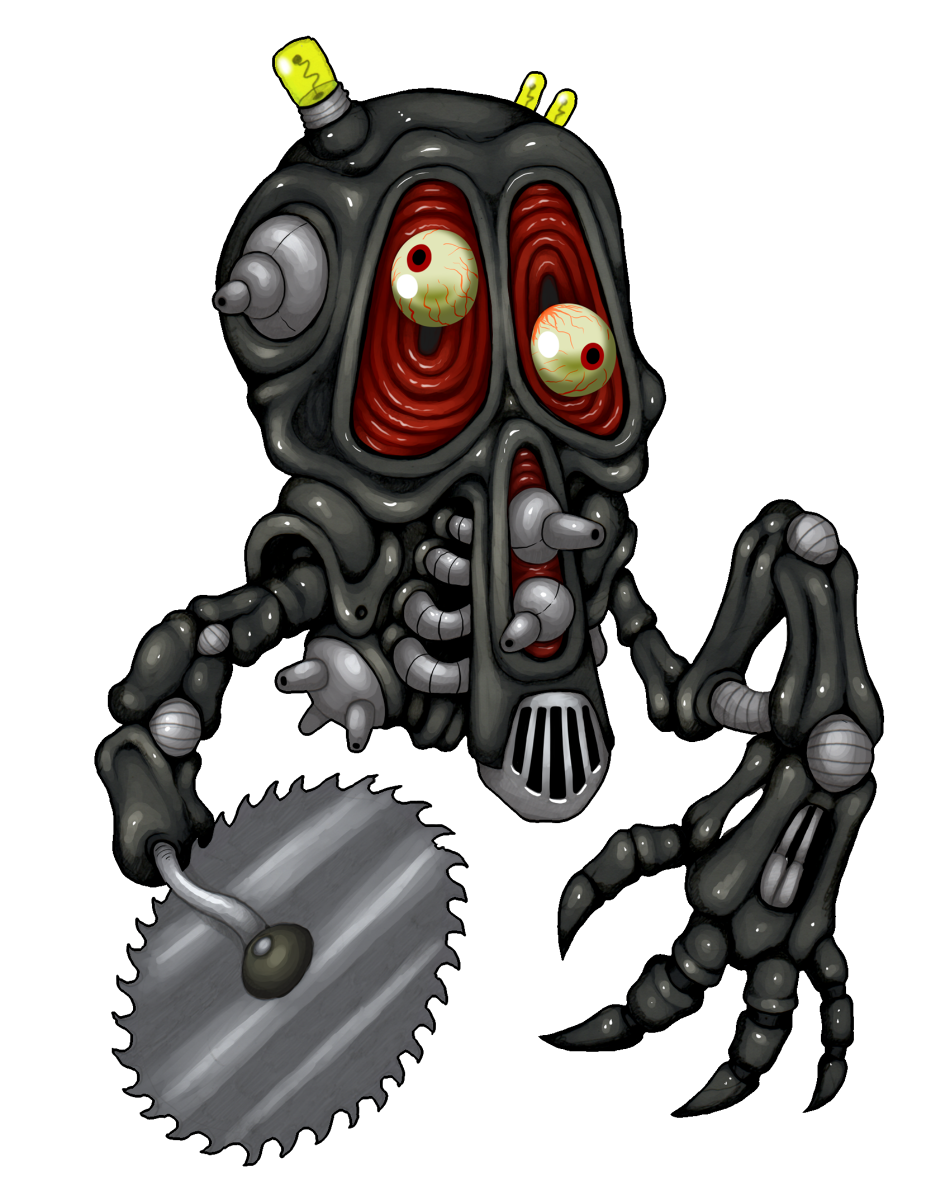 A rather large, hovering biomechanoid with a grey to black chassis, shaped somewhat like a vertically stretched skull, with various mechanical tubes, nozzles, and electrical bulbs protruding from it. Its organic eyeballs whirl in tall sockets pulsing with red inner flesh. It has two large, mechanical, skeletal looking arms, one ending in a taloned hand and the other in a massive buzzsaw.