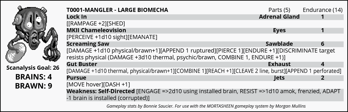 Despite the questionable veracity of its alleged origins, much of the Mangler's enigmatic publicity blurb checks out; its degree of autonomy far and away surpasses any previously documented Biomecha, as independently sapient as any Bioconstruct from the moment of its replication. Much of this exceptional built-in processing power is devoted to its eponymous function, spending most of its downtime devising creative new ways to render even the hardiest opponents into messy chunks and pooling fluids. A patient teacher may be able to instruct the mech in more constructive violence - such as butchering, demolition, landscaping or papercraft - supposing they can account for its tendency to lose itself in the delight of its own purpose.