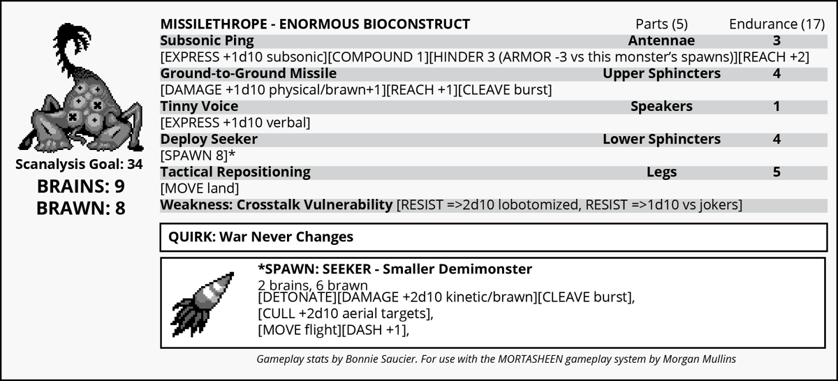 The "warbids" are older monsters and popular fan favorites, so the original species, Bombadire, made it into book one with expanded lore, and I sketched this new "missile tower" cousin a while back as a potential addition for future books. You can have it early, and you can also have a preview of Bombadire's book page:GAMEPLAY BLOCK: