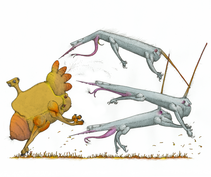 It's a good example of how much one animal group can vary, which a lot of science fiction unfortunately fails to take advantage of. These two species superficially look nothing alike, but the basic evolutionary template is still all there, just as both a frogfish and a seahorse are technically both bony fish, or a vampire bat and a blue whale are both mammals. The artist hasn't done a whole lot of other illustrations of this planet, but I'd definitely look forward to what more can be done with it.